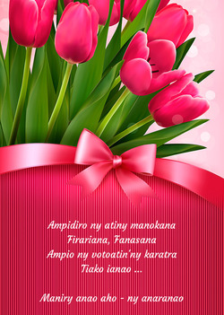 Mahatsiaro manokana an-dryh aho am’zao andro manokana izao.Andro miavaka natokana ho an-dryh ny andro androany,,ka izay no matanga ahy anao izao,hiarabako anao. Ndryh ilay olona nahababon’ny foko nohon’ny fahamatorana sy ny hatsara-po ndryh,,vady modely ndryh amikou. Tiako ho tsapanao fa manandanja lehibe ho ahy ny fisinao eo amin’ny fiainakou,,misaotra misy vadikou ah. Ary tsarovy fa nitondra fahazavana lehibe teo amin’ny fiainako ny fisin-dryh,,hafa mihintsy ndryh vadikou(…)malalakou tsy foikou